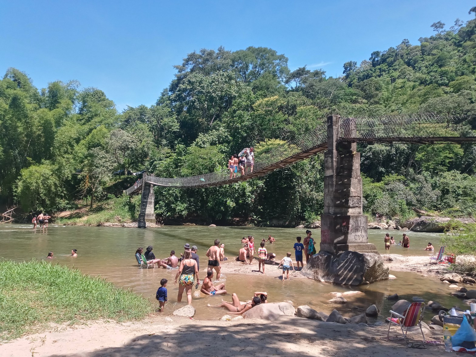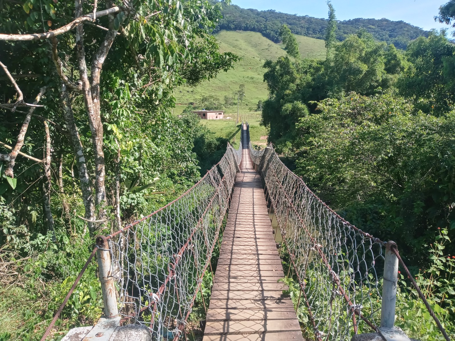 Vi dro til et nytt sted idag. En ny turistattraksjon. Et sted som heter Ponte de Arame de Cachoeiros de Macaé. En annen hengebru i Casimiro de Abreu. Den andre vi besøker på turen. Hengebruer er visst populært her. Arame betyr forresten vaier på portugisisk og Ponte betyr bru. Du ser kanskje på artikkelbildet at brua er bygget i metallvaier? Sånn som den forrige? Uansett….