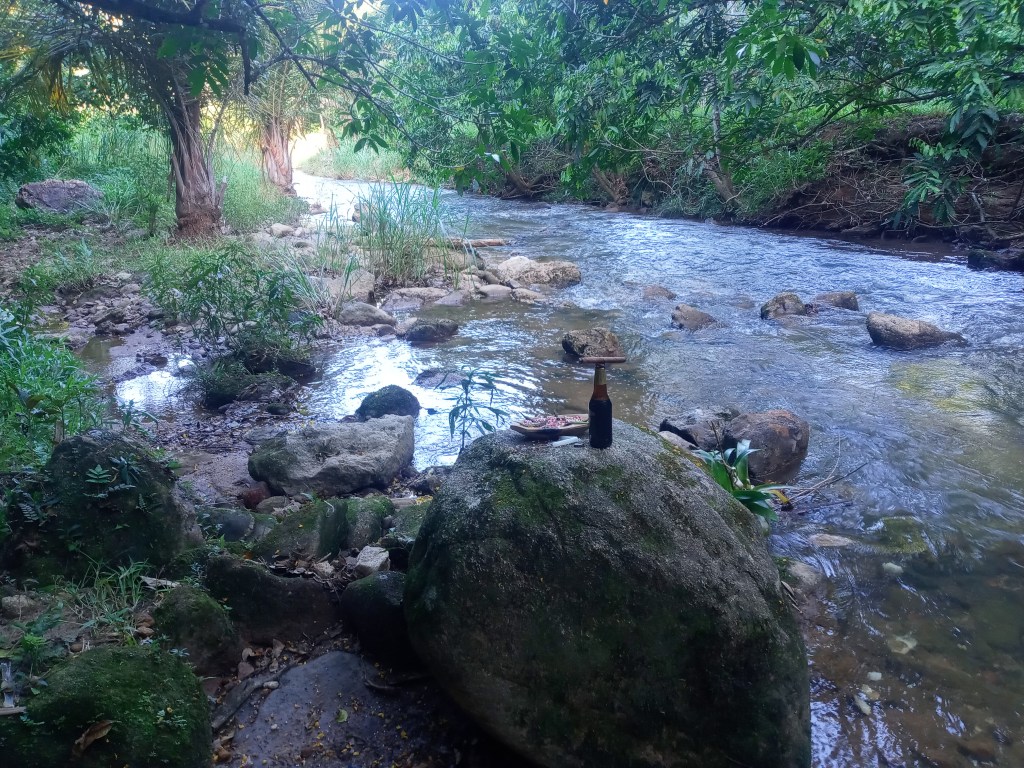 Jeg gikk ned til elva jeg gikk etter og der var det noen som hadde laget et voodoorituale. Jeg har sett sånt flere ganger i Brasil på diverse steder. Jeg er ikke overtroisk eller religiøs, men i denne settingen ble det ganske ekkel stemning. Det sies at går man forbi eller tar på sånne ritualer får du en forbannelse over deg. Jeg vet ikke nøyaktig hvordan det foregår, men litt langt inn i jungelen, og det begynte å mørkne gjorde situasjonen meg litt paranoid. Jeg så eller hørte ikke antydning til andre folk heller. Denne turen ble såpass ubehagelig at jeg gikk tilbake i et raskere tempo for å finne igjen min bedre halvdel. Hun satt fortsatt og nippet til en Heineken, og jeg bestilte meg en selv. Noe må man roe nervene med.
