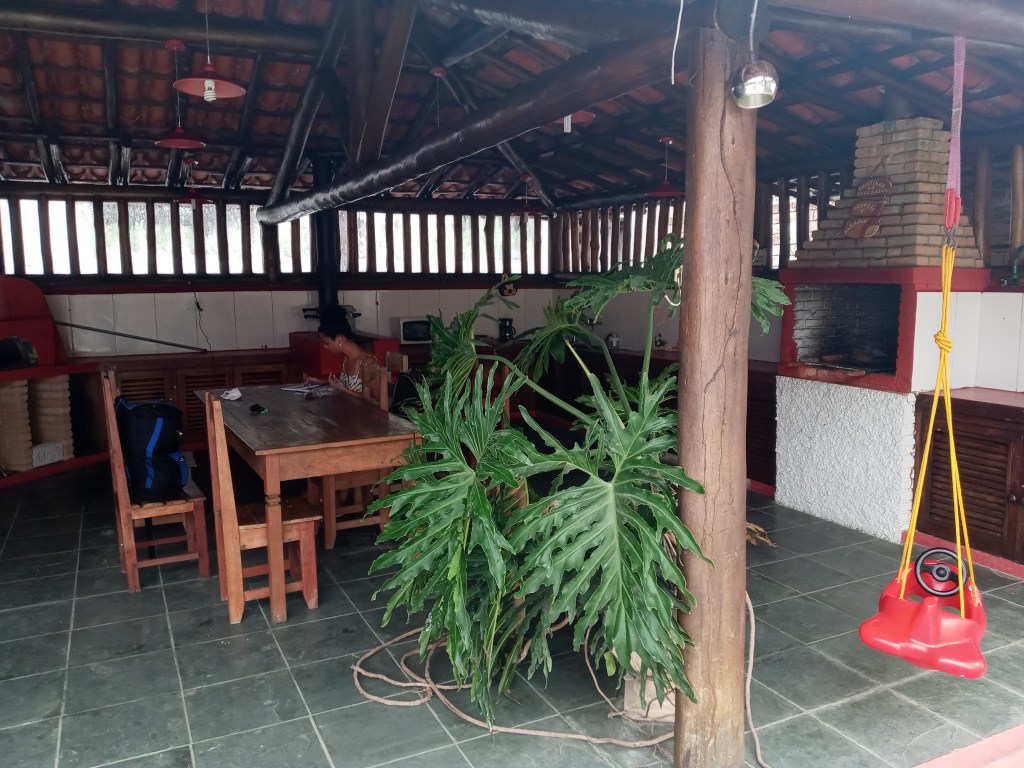 Det var et slit å komme seg inn på sovestedet kona hadde funnet på Booking.com. Da vi sto foran inngang på gjestgiveriet var det absolutt ingen som åpnet porten for oss. Var vi på riktig sted? Vi ble stående en stund og plutselig dukket det ei ung dame opp som jobbet der som forsikret oss om at vi hadde kommet til rett adresse. Vi fikk en bra pris etter litt pruting, 730 reais for ei uke. Jeg skal ikke påstå rommet vi fikk var noe luksuriøst. Det var ingen vinduer der bortsett fra et lite et på badet, og de grå veggene virket veldig fengselsaktig. Det var noen utskjæringer fra kristusstatuen i Rio de Janeiro de hadde dekt veggen med, noe jeg synes var rart ettersom Ubatuba som nevnt ligger i delstaten São Paulo.