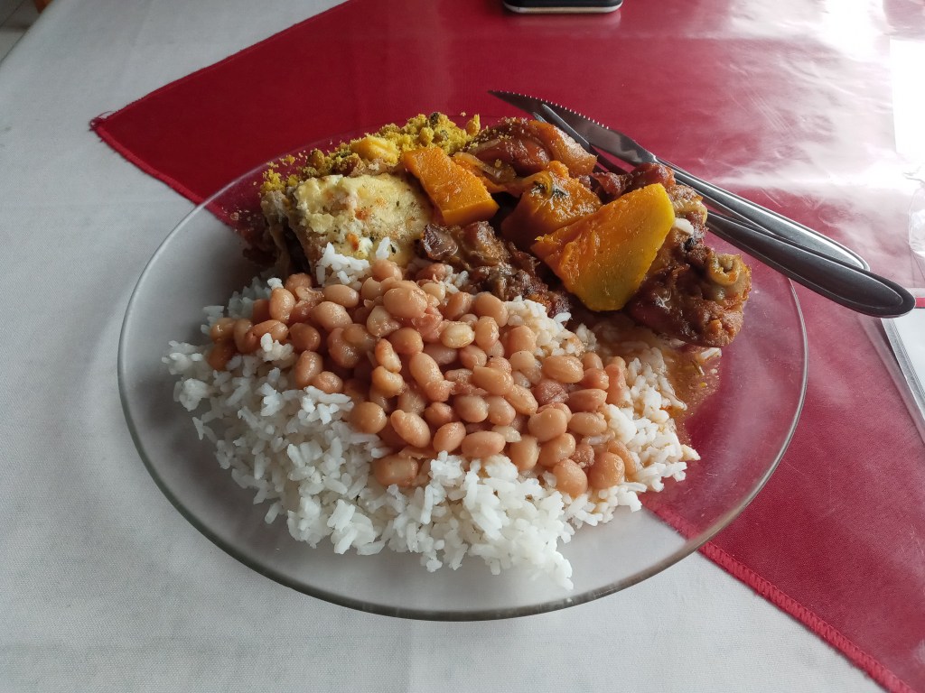 Maten besto av kylling.gresskar,ris,bønner og en annen matbit jeg ikke vet navnet på. Det smakte helt nydelig og den snakkesalige kelneren kunne ikke skryte nok av Norge mens jeg spiste. Skjønte ikke alt han sa. Dialekta er litt annerledes her og mannen snakket forferdelig fort med ei maske foran munnen for å bekjempe koronaen. Det var ikke mye av samtalen som mest gikk en vei jeg fikk med meg. Det ble alt i alt en meget hyggelig matopplevelse. Kelneren hadde også en imponerende myntsamling som han stolt viste frem til oss. Det tok ikke lang tid før jeg fant igjen norske krona. Klarer dere å finne den på bildet? Det har nok hvert nordmenn på dette stedet før.