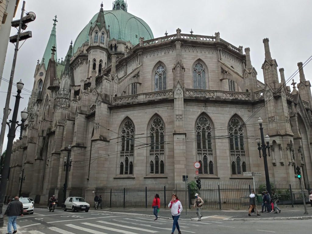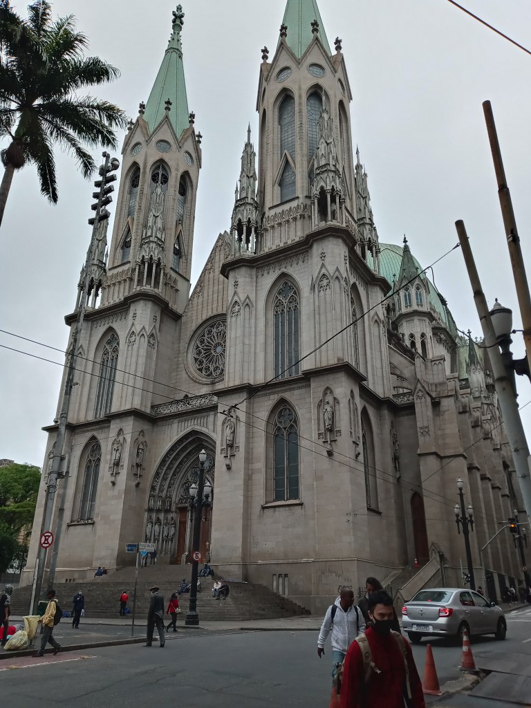 Storbyen São Paulo er definitivt stor nok. Det er nesten litt skremmende noenganger å gå rundt i denne enorme byen, spesielt for en nordmann oppvokset på landsbygda. Byen er skremmende og spennende på en gang, men det er faktisk en trygg by å ferdes i, spesielt i forhold til andre storbyer i Brasil. Byen er kjent for å være veldig rik, og metropolen har tiltrekt rikmannsfolk fra alle verdenshjørner som har investert tungt i denne byen. Jeg og kona gikk ut tidlig denne dagen også. Litt kaldt, under 20grader, i tillegg kom det duskregn i perioder. Skikkelig klamt vær. Litt for kaldt å gå i shorts, litt for varmt å gå i bukse. Vi gikk forbi en utrolig flott kirke som het Catedral Metropolitana de São Paulo.