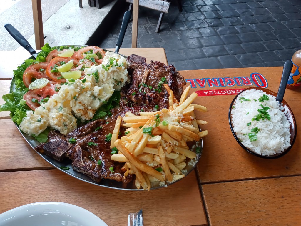Jeg husker ikke hele kvelden jeg var her sist og alle som er glad i øl vet vel hvor nærvepirrende det kan være å gå tilbake på en plass man ikke helt husker hva man gjorde noen dager i forveien etter litt for mye alkohol? Heldigvis var det fullstappet av folk der og det var satt opp telt nedover hele gata der selgere solgte alt man trenger til hva det måtte være. Kjempebra tenkte jeg. Hvis jeg faktisk har gjort noe galt her i fylla så legger de ikke merke til meg uansett. Her sklir man lett inn i folkemengden og forblir anonym. Jeg måtte selvfølgelig varte opp min bedre halvdel også. 8år som gift er lenge det, selv om det ikke føles så lenge. Vi fant et flott sted å spise. Det er lett å finne det i dette området. Flotte barer og spisesteder nedover hele gaten, kun brutt opp av ei gammel majestetisk kirke på visse steder. Husker ikke helt navnet på restauranten vi satte oss på, men det hang et skilt at dagens måltid var t-bone steik til 60real for 2personer. Når vi fikk porsjonen kunne det nok mettet et par folk til, heldigvis kom jeg på tom mage og da er det nesten utrolig hvor mye jeg er i stand til å spise.