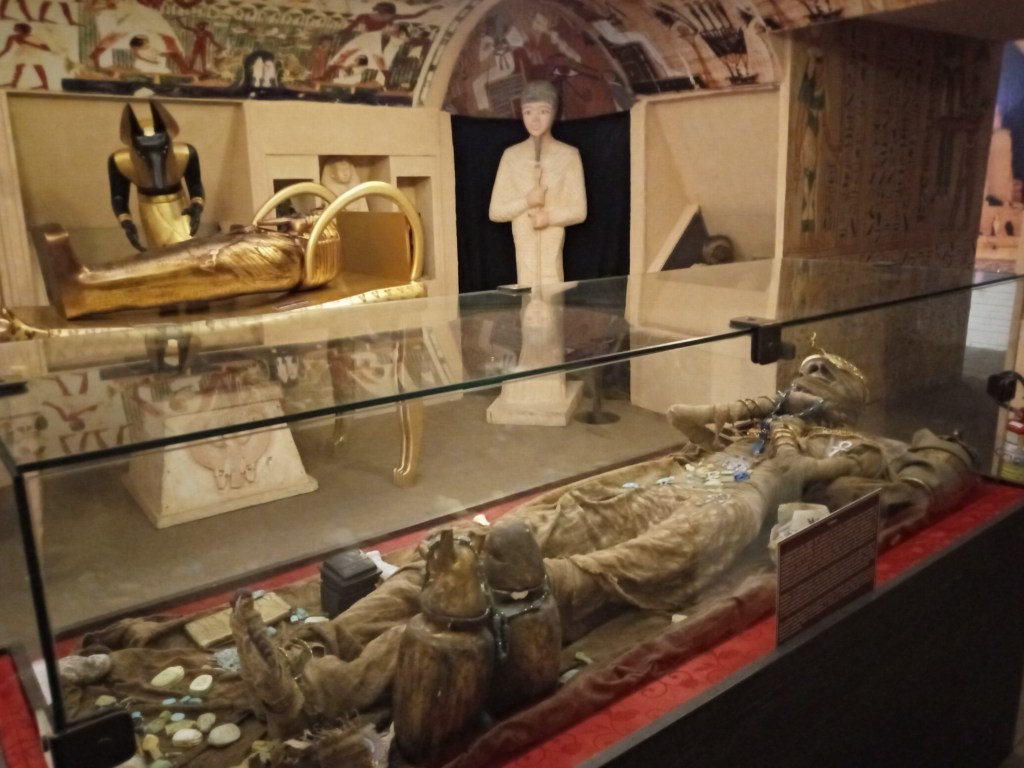 Inngangspartiet og bygget til museumet var flott å se på. Nesten som man skulle tro man faktisk var i Egypt og det kostet ikke mer en 40real og komme inn. Det var flott inne også, og det var heldigvis lov til å ta bilder inne på stedet. Det var mye informasjon om pharaoer og mange forskjellige guder. Det var ikke oversatt til engelsk noe jeg synes var litt rart. Det myldrer av turister i denne byen, men hvor mange som er engelsktalende vet jeg ikke. Var en replika av en pyramide inne i bygget også, og inne i pyramiden kunne man se noen skjeletter som var gravlagt med smykker og gull, selvfølgelig også replikaer og ikke døde individer.