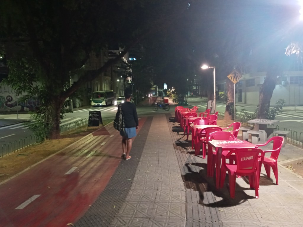 Vi kom frem til et ganske fint sted med masse stoler som var satt opp midt i veien. Et sted man kunne sitte å slappe av, men jeg så ingen folk der. Det var en mannlig prostituert som begynte å snakke med meg og kona, men ingen av oss skjønte hva han sa. Den uhyggelige personen begynte allikevel å følge etter oss og jeg var en periode redd for at vi kunne bli overfalt og ranet. Vi fikk ristet han av oss og vi fant tilfeldigvis en liten matbutikk som fortsatt var åpen. Vi gikk forbi noen barer også, men ikke snakk om at jeg skal sitte her å ta en kald en. Vi fikk kjøpt noe kjeks og frukt så vi slapp å legge oss på tom mage, og selv om hele kvelden hadde en uhyggelig stemning over seg så fikk vi sove tilslutt. Snart et det videre til neste by.