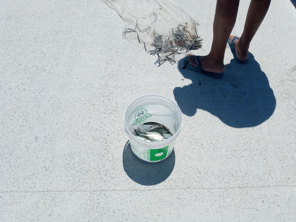 Hver gang jeg er i byen må jeg selvfølgelig stikke ned på stranden en tur for å ta et par bilder og en rask dukkert, noe jeg også gjorde denne dagen. Det sto en fisker der også som fisket med et nett han kastet uti vannet for hånd. Jeg synes det var en merkelig fiskemåte, men han hadde tatt en del småfisk. Jeg slo av en liten prat med han og spurte pent om å få ta et bilde. Såklart, sa han, men selv så var han ikke så interessert å være med på fotograferingen. Han gikk litt unna når jeg tok bildet. Fiskenettet og fisken fikk jeg ihvertfall lov til å ta bilde av, og beina og sandalene av mannen.