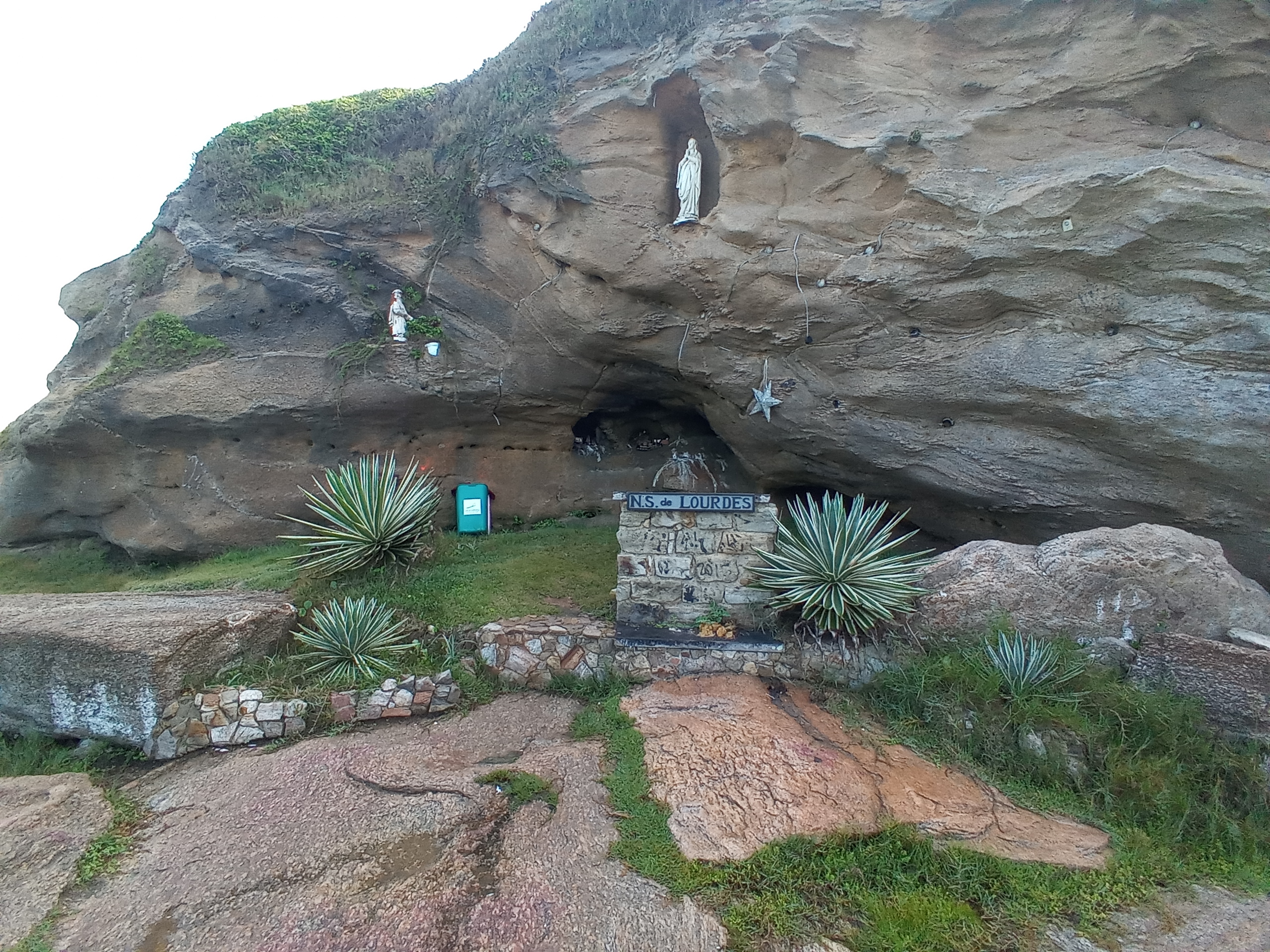 Ved siden av kirka gikk det en liten sti som ledet oss til Gruta Nossa Senhora de Lourdes. En annen severdighet på samme bakketopp, men liggende på siden av berget lengre ned mot havet. Lett å finne frem. Det var skiltet og stien førte oss til stedet. Jeg så for meg ei diger grotte man kunne gå inn i ettersom gruta betyr nettopp grotte, og ble litt skuffa faktisk. Dette var ikke rare grotta, bare et lite hull i en fjellvegg med noen religiøse små statuer satt opp på noen stenhyller. Var en del tomme ølflasker der også, og ganske uryddig generelt.