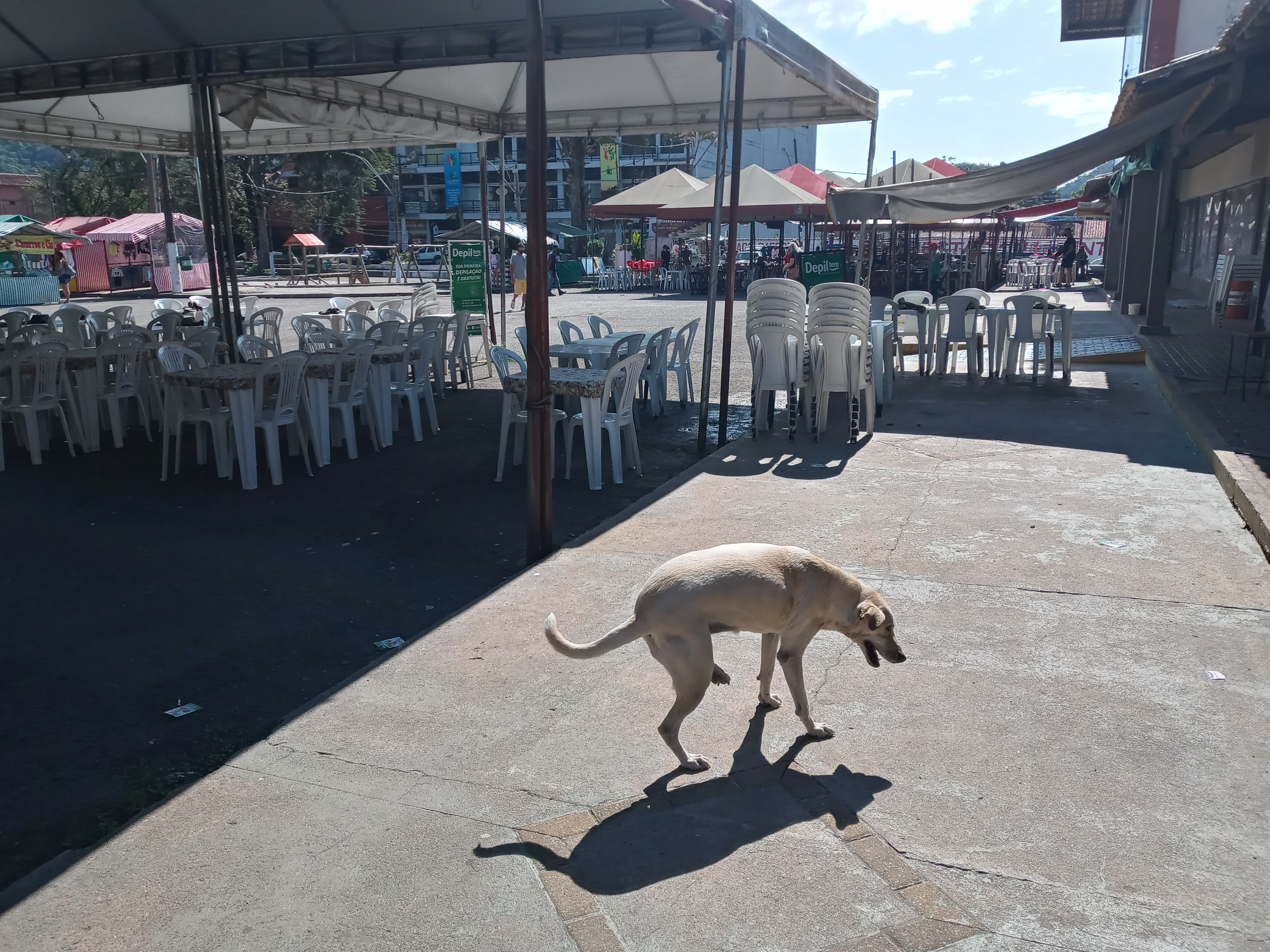 Vi gikk etter ganske kort tid. Det ble litt for mye mas for både meg og kona. På markedsplassen var det mange spisesteder, men det var ingen som hadde begynt å servert noe mat enda. Jeg merket humøret sank ettersom sulten økte. Dukket opp en stakkars gatehund på stedet også, som gikk på 3bein. Det var nok ikke bare jeg som var sulten. Stakkars dyr.