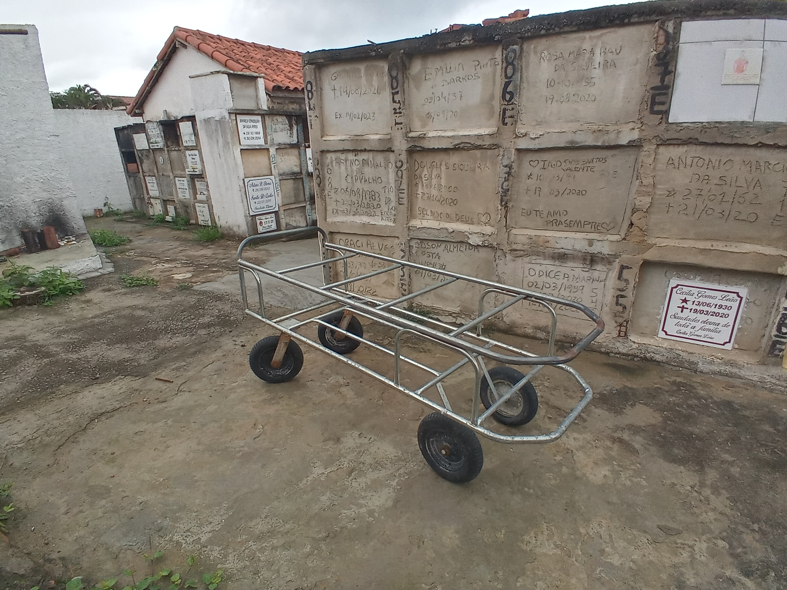Kirkegården gikk i en lett bakke, men var ikke så veldig stor. I enden på den, på toppen av bakken var det en masse skuffer i veggene. Det er ikke uvanlig at folk blir gravlagt og murt igjen i veggene. De skriver på skuffen hvem som ligger der før betongen tørker. Jeg tok et bilde av stedet og jeg fikk med meg ei tralle på bildet i tillegg. Det er den de bruker for å trille kista. Ble en litt trist artikkel dette og jeg merker jeg ble litt trist selv også. Jeg får finne på noe gøy når sola atter engang titter frem og komme sterkere tilbake med noen hyggelige artikler fra Brasil.