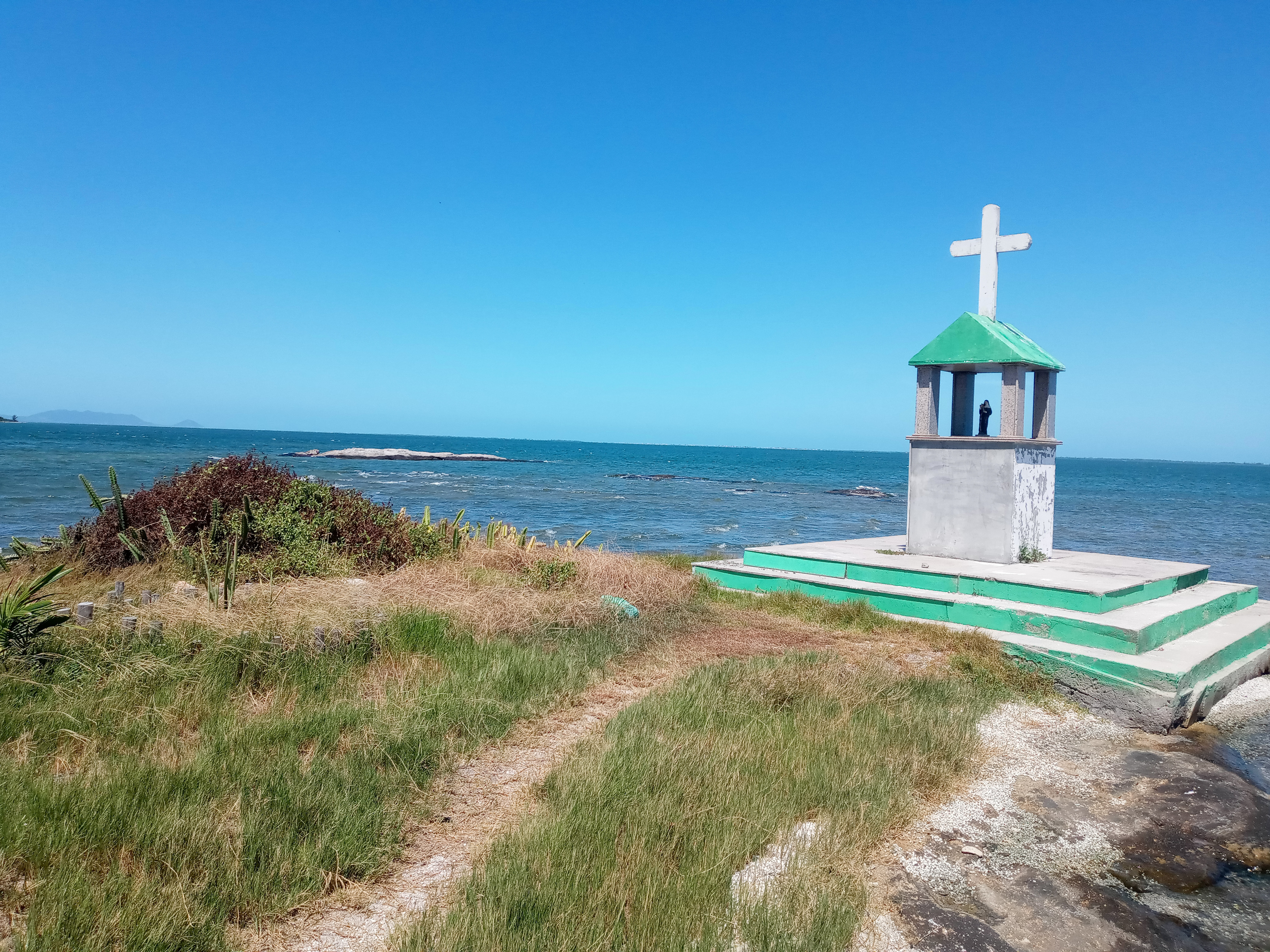 Det var ingen andre der så jeg hadde ingen å gå etter. Stranden var helt tom for folk. Jeg var tidlig ute, i tillegg mitt i uka. Det er roligere her da. Ingen folk som drikker øl, ingen strandbarer åpne, ihvertfall ikke så tidlig på morgenen. Turen gikk greit, men vannet rakk meg opp til halsen. Vel fremme var det et imponerende lite sted. En oppmuret liten platting det var en liten religiøs statue på, sikkert derfor øya heter Ilha de Santa Rita, som noen hadde tatt seg tid til å bygge mitt på øya.
