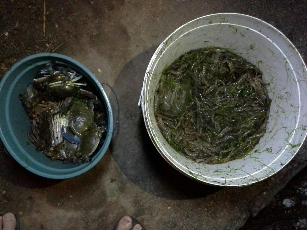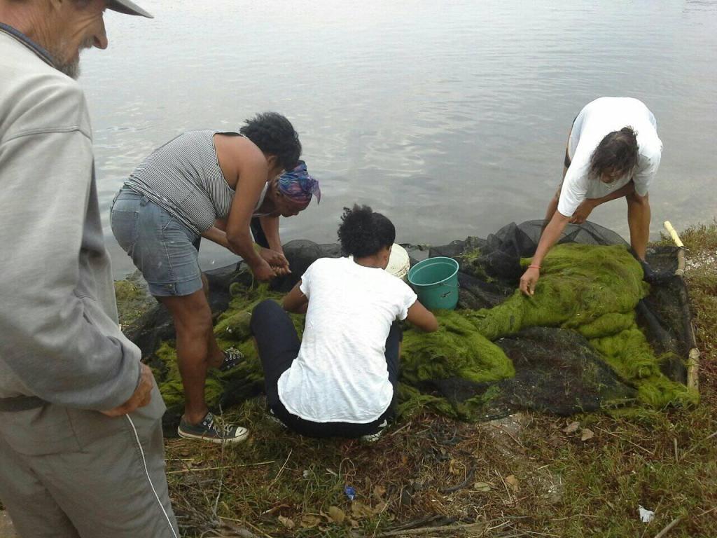 Og hjelpere trenger man for å fiske reker. Man måtte dra dette enorme nettet, en på hver side, og skrape etter havbunnen. Det var veldig grunt i lagunen, så vi trengte ikke bekymre oss for drukningsulykker. Vi byttet på å dra dette nettet, og det var utrolig slitsomt, men spennende når vi fikk nettet på land. Vi fikk en del reker og krabber per tur, men det var allikevel vanskelig å finne de igjen pga all bunnslammet som også lå i nettet. Den grønne mosen jeg ikke kan navnet på som lå i nettet (Tang,Tare?) måtte forsiktig fjernes for å se om det var reker gjemt imellom lagene. Jeg var egentlig mest redd for å bli klipt i fingrene av disse krabbene som også ble liggende mellom den grønne, moselignende havbunnen som fulgte med nettet. Hun ene tanten til kona som også var med sa at jeg ikke trengte å være redd, det hadde vært verre om den hadde bitt meg i tissen. Alltid litt frekk i munnen den dama, men har truffet henne før så jeg vet sånn ca hva slags humor hun har.
